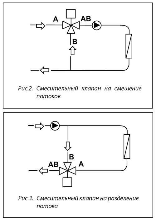 Клапан смесительный, поэтому направление потоков регулируемой среды должно корреспондироваться со стрелками на рис. 1, 2.