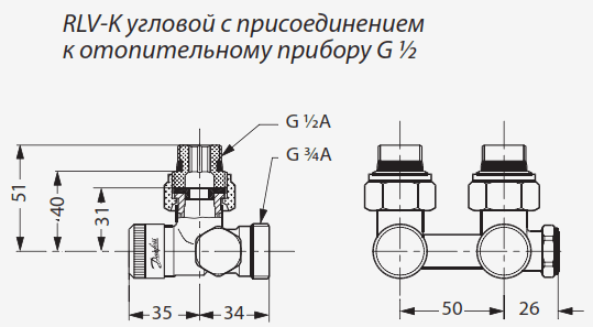 Клапан Danfoss RLV-K (003L0282) с возможностью его опорожнения для нижнего присоединения к радиатору трубопроводов двухтрубной или однотрубной системы отопления, предназначен для подключения к
