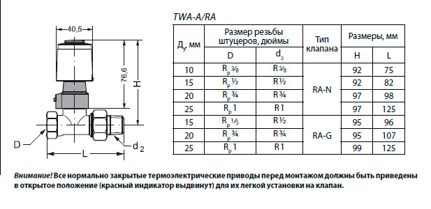 Термоэлектрический мини-привод Danfoss TWA-A (088H3111) -Термоэлектрические мини-приводы серии TWA предназначены для двухпозиционного управления различными регулирующими клапанами в системах отопления, теплоснабжения и охлаждения местных вентиляционных установок. Привод оснащен визуальным индикатором хода, который показывает, находится клапан в закрытом или открытом положении.Приводы TWA, в зависимости от их модификации, могут использоваться с клапанами серии RTD, RA производства компании Danfoss, а также с клапанами фирмы Heimeier, имеющими резьбу для крепления привода M 30 х 1,5. В случае применения привода с другими типами клапанов клапан должен быть индивидуально проверен на совместимость геометрии и обеспечение его закрытия. Питающее напряжение электропривода — 24 или 230 В. Клапаны могут быть нормально закрытыми при отсутствии напряжения (NC) и нормально открытыми (NO). Кроме того, нормально закрытый привод с питающим напряжением 24 В поставляется с концевым выключателем (NC/S).