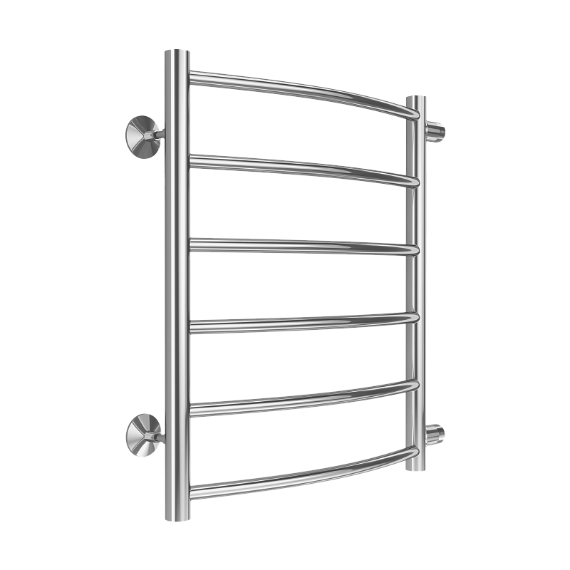 выполнена в форме лесенки с поперечными перекладинами из круглой трубы. Поверхность изделия отполирована до зеркального блеска, что придает образу роскошь и особый шарм. Полотенцесушитель