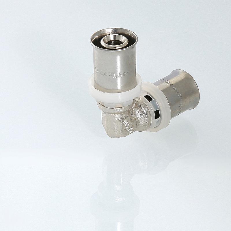 (VTm.251.N) Пресс-фитинг – угольник, обеспечивающий соединение труб (металлопластиковых или из сшитого полиэтилена) под углом 90 градусов. Особенности конструкции изделия, используемые материалы обусловили надежность соединений, повышенную пропускную способность, температурную стойкость, механическую прочность. При изготовлении пресс-угольника используются высококачественные материалы: сантехническая латуни CW617N с никелевым покрытием (корпус), нержавеющая сталь (гильза), EPDM (уплотнительные кольца, 2 шт. для каждого штуцера). Фиксатор, одновременно играющий роль диэлектрической прокладки, делается из нейлона. Монтаж соединителя выполняется пресс-инструментом с насадкой «ТН».