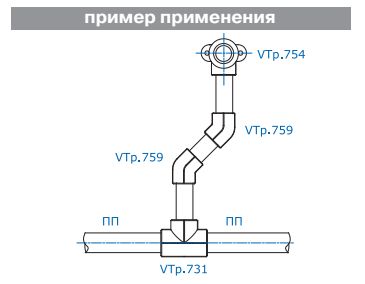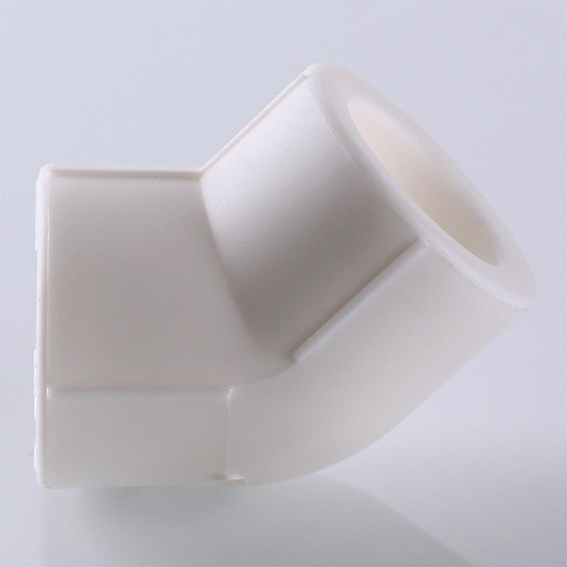 (VTp.759.0) Двухсторонний угловой полипропиленовый фитинг (отвод), позволяющий изменить направление полипропиленового трубопровода на 45°. Монтаж осуществляется методом раструбной сварки.